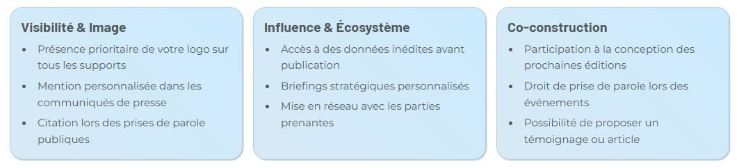 Chaque sponsor reçoit un rapport d'impact personnalisé incluant reprises presse, indicateurs de visibilité, verbatims de participants et statistiques réseaux sociaux.